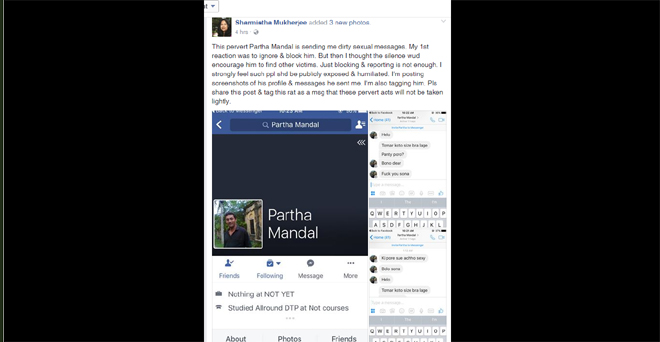 अपनी पोस्ट में शर्मिष्ठा ने लिखा है, 'यह विकृत मानसिकता का आदमी पार्थ मंडल मुझे भद्दे अश्लील मेसेज भेज रहा है। पहले तो मैंने सोचा कि मैं इसे इग्नोर करके ब्लॉक कर दूं। लेकिन बाद में मैंने सोचा कि चुप रहने से इसका हौसला बढ़ेगा और यह दूसरी लड़कियों के साथ ऐसा करेगा। केवल ब्लॉक करना और इसकी शिकायत (फेसबुक से) करना ही काफी नहीं है।