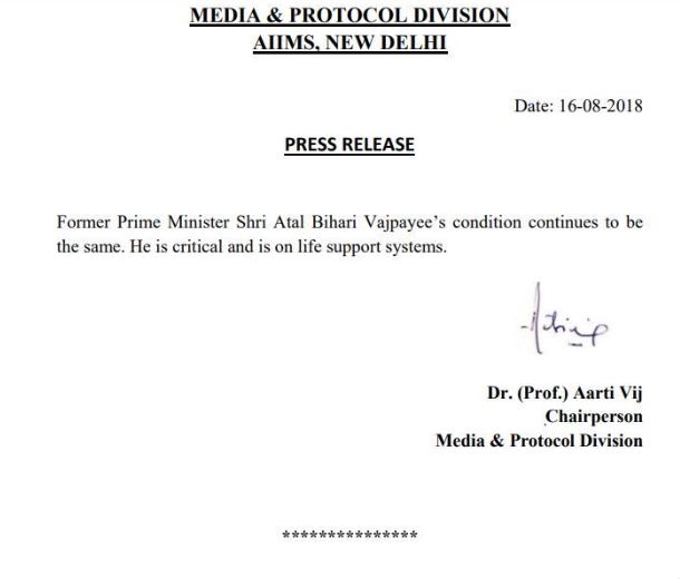 एम्स से बाहर निकलकर केंद्रीय स्वास्थ्य मंत्री जेपी नड्डा ने संवाददाताओं से कहा कि अटल जी की हालत अब भी बेहद नाजुक बनी हुई है। कुछ देर बाद अस्पताल की ओर से मेडिकल बुलेटिन जारी किया जाएगा। नड्डा ने बताया कि डॉक्टर वाजपेयी जी को ठीक करने के लिए पूरी ताकत लगा रहे हैं।