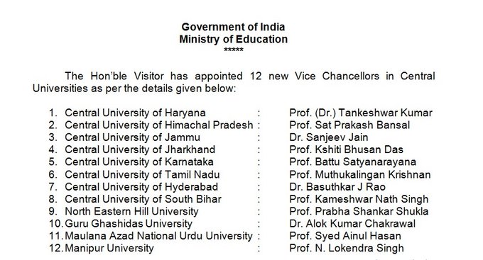 एमओई के एक अधिकारी ने जानकारी देते हुए कहा, "राष्ट्रपति ने 12 केंद्रीय विश्वविद्यालयों के लिए वीसी की नियुक्तियों को मंजूरी दे दी है।" विश्वविद्यालयों में हरियाणा केंद्रीय विश्वविद्यालय, हिमाचल प्रदेश, जम्मू, झारखंड, कर्नाटक, तमिलनाडु और हैदराबाद शामिल हैं।