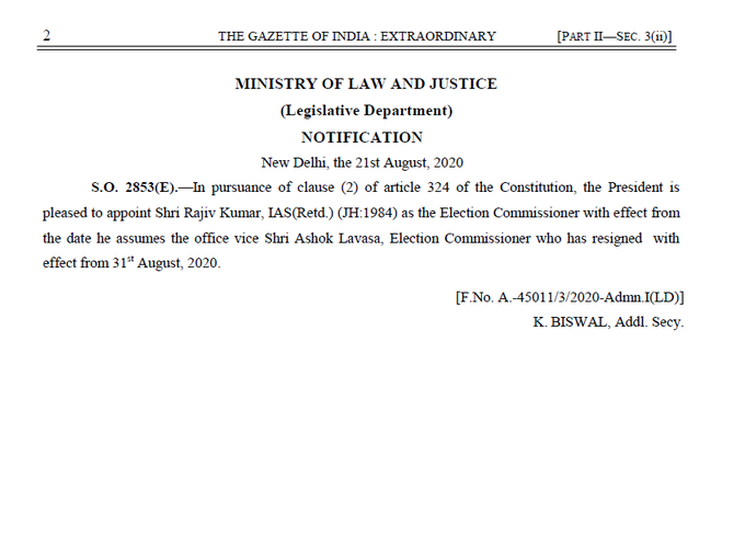 कानून एवं न्याय मंत्रालय की एक अधिसूचना के मुताबिक, '' संविधान के अनुच्छेद 324 के खंड (2) के अनुसार राष्ट्रपति ने राजीव कुमार (सेवानिवृत्त आईएएस) को चुनाव आयुक्त के पद पर नियुक्त किया है। उनके पदभार ग्रहण करने की तिथि से उनकी नियुक्ति प्रभावी होगी।''