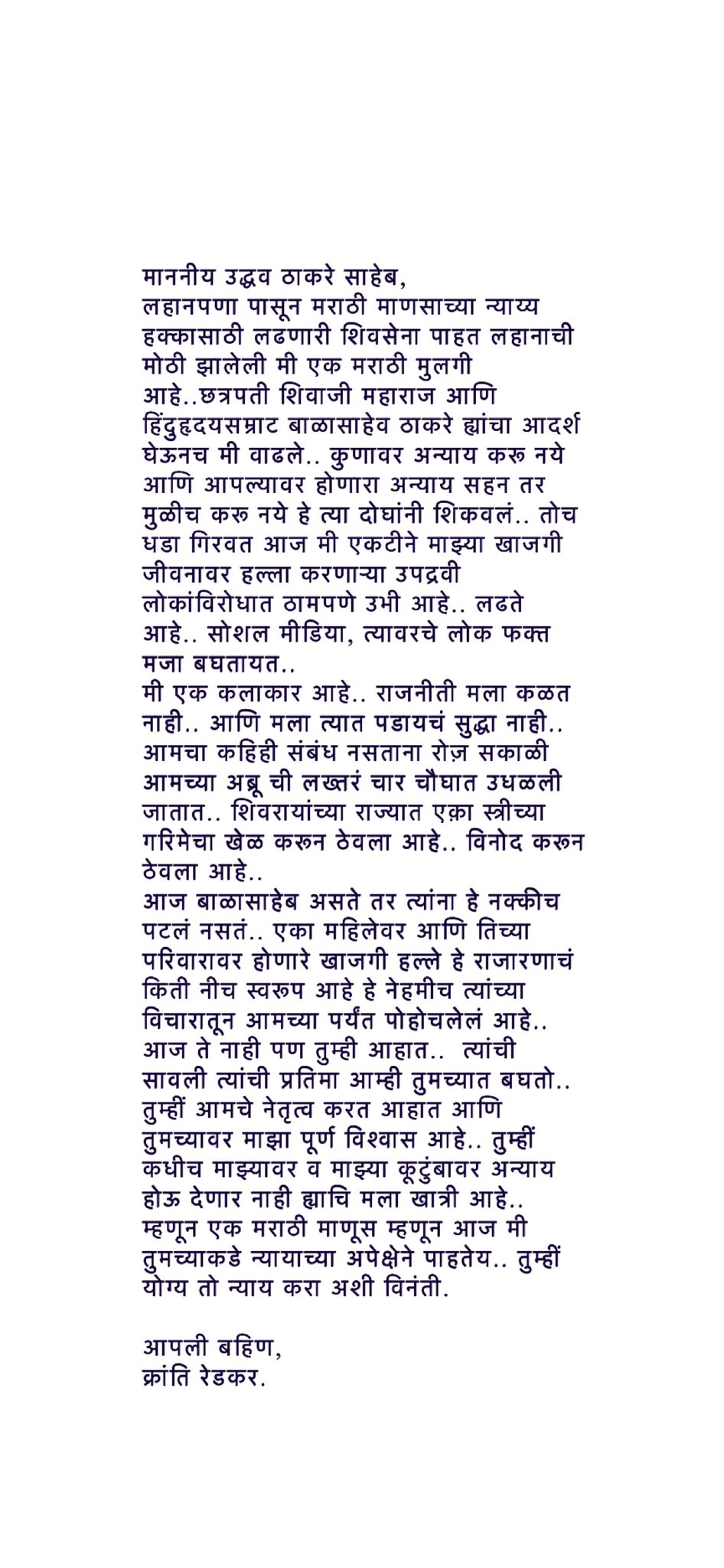 क्रांति ने अपने पत्र में लिखा, माननीय उद्धव जी बचपन से मराठी आदमी के न्याय हक के लिए लड़ने वाली शिवसेना को देखते हुए मैं एक मराठी लड़की बड़ी हुई। बाला साहब ठाकरे और छत्रपति शिवाजी से सीखा कि किसी पर अन्याय करो मत, खुद पर अन्याय सहो मत। उसी के मद्देनजर आज मैं अकेले मेरे निजी जीवन पर हमला करने वाले लोगों के खिलाफ मजबूती से खड़ी हूं और लड़ रही हूं।