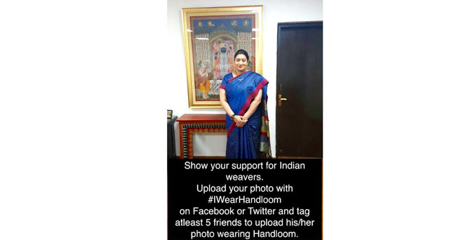 कपड़ा मंत्रालय संभालने के बाद स्मृति ईरानी बुनकरों के लिए बड़ा करने की सोच रही है। इसकी शुरुआत उन्होंने हैंडलूम यानी हथकरधा से बने कपड़े पहनने की अपील से शुरू की है। उन्होंने खुद अपने ट्विटर अकाउंट पर नीले रंग की हथकरघा की साड़ी पहन कर की है। यह साड़ी बिहार में मनी है।