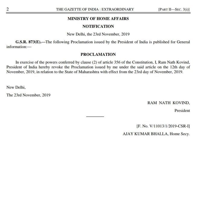 राष्ट्रपति कोविंद द्वारा हस्ताक्षर किए गए राज-पत्र के अनुसार, ‘संविधान के अनुच्छेद 356 के खंड (2) द्वारा प्रदत्त शक्तियों के अनुसार, मैं भारत का राष्ट्रपति राम नाथ कोविंद, मेरे द्वारा 12 नवंबर 2019 को महाराष्ट्र राज्य के संबंध में की गई घोषणा को निरस्त करता हूं, जो 23 नवंबर 2019 से प्रभावी है।’
