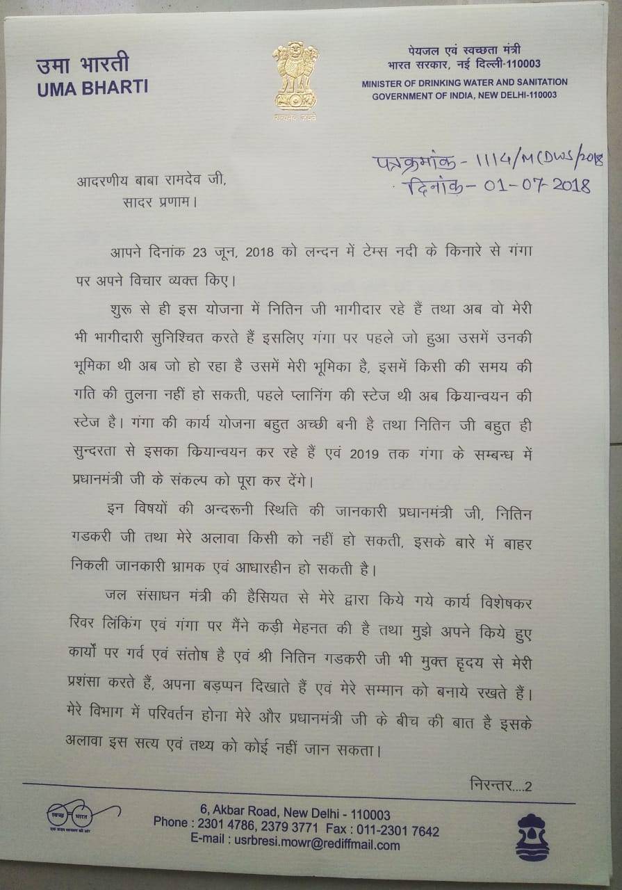 उमा भारती को दो मंत्रियों की इस तरह तुलना अजीब लगी। उन्होंने अब इस मामले पर चुप्पी तोड़ते हुए बाबा रामदेव को बाकायदा एक पत्र लिखा है। इसमें उन्होंने लिखा कि इस योजना में शुरू से ही नितिन जी भागीदारी रहे हैं। अब वे मेरी भी भागीदारी सुनिश्चित करते हैं। गंगा पर पहले जो हुआ उसमें उनकी भूमिका थी, अब जो हो रहा उसमें मेरी भूमिका है। इसमें तुलना नहीं हो सकती। पहले प्लानिंग की स्टेज थी और अब क्रियान्वयन की स्टेज है। 2019 तक गंगा के संबंध में प्रधानमंत्री जी संकल्प पूरा कर देंगे।