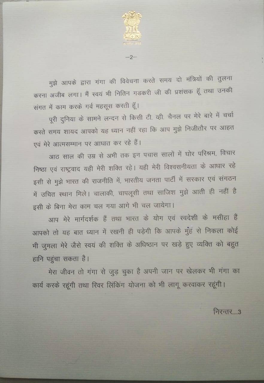 उमा ने पत्र में कहा कि मुझे आपके द्वारा गंगा की विवेचना करते समय दो मंत्रियों की तुलना करना अजीब लगा। मैं स्वयं भी नितिन गडकरी जी की प्रशंसक हूं। साथ ही उनकी संगत में काम करके में गर्व महसूस करती हूं। उमा भारती ने कहा कि पूरी दुनिया के सामने लंदन से एक टीवी चैनल पर मेरे बारे में चर्चा करते समय शायद यह आपको ध्यान नहीं रहा कि आप मुझे निजी तौर पर आहत और मेरे आत्मसम्मान पर आघात कर रहे हैं।