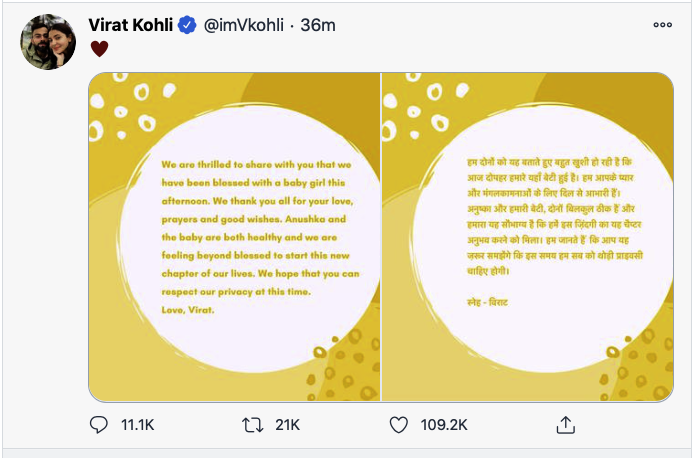 विराट कोहली ने ट्वीटर पर संदेश शेयर करते हुए कहा, हम दोनों को यह बताते हुए बहुत खुशी हो रही है कि आज दोपहर हमारे यहां बेटी हुई है। हम आपके प्यार और मंगलकामनाओं के लिए दिल से आभारी हैं। आगे उन्होंने कहा, अनुष्का और हमारी बेटी, दोनों बिल्कुल ठीक है और हमारा यह सौभाग्य है कि हमें इस जिंदगी का यह चैप्टर अनुभव करने को मिला। हम जानते हैं कि आप यह जरूर समझेंगे कि इस समय हम सब को थोड़ी प्राइवसी चाहिए होगी।