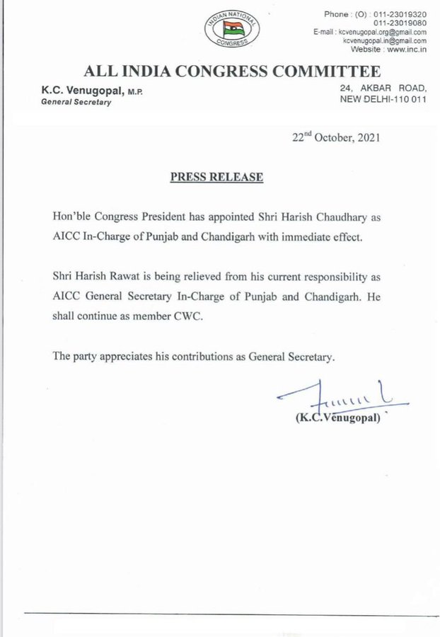 पंजाब में अगले साल विधानसभा चुनाव होने हैं। चुनावों से कुछ महीने पहले ही कांग्रेस ने पंजाब में कई बड़े फेरबदल किए हैं। जिसमें सबसे बड़ा फेरबदल सीएम कैप्टन अमरिंदर सिंह की हटाना था। इस दौरान कांग्रेस ने अपने राज्य इकाई को अध्यक्ष को भी बदला है। अब पंजाब कांग्रेस के अध्यक्ष नवजोत सिंह सिद्धू हैं। लेकिन शुक्रवार को कांग्रेस में पंजाब को लेकर एक और बड़ा बदलाव किया है। कांग्रेस हाईकमान ने पंजाब कांग्रेस प्रभारी को बदल दिया है। पार्टी ने सीनियर कांग्रेस नेता हरीश रावत की जगह राजस्थान सरकार में कैबिनेट मंत्री हरीश चौधरी को पंजाब और चंडीगढ़ का तत्काल प्रभाव से प्रभारी नियुक्ति किया है। वहीं पार्टी की ओर से जारी लेटर में कहा गया है कि, हरीश रावत कांग्रेस कार्यकारणी के अध्यक्ष बने रहेंगे। हरीश रावत का कांग्रेस प्रभारी के पद छोड़ने की वजह उत्तराखंड में होने वाले विधानसभा चुनावों को माना जा रहा है।