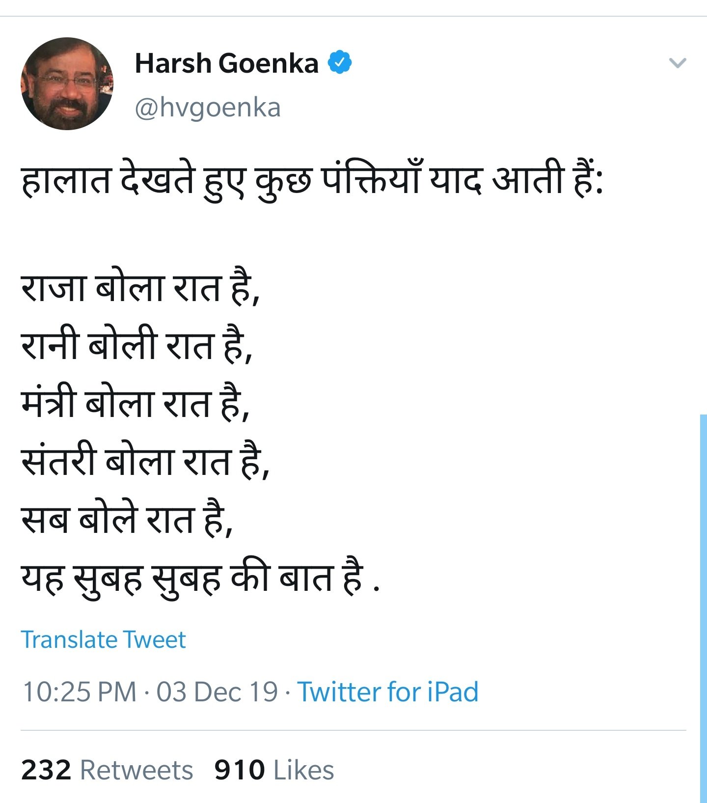 हर्ष गोयनका ने मंगलवार रात गोरख पांडे की एक मशहूर कविता ट्वीट की। हालांकि बाद में उन्होंने अपना ट्वीट हटा लिया। लेकिन इसका स्क्रीन शॉट उपलब्ध है और सोशल मीडिया पर शेयर किया जा रहा है। उन्होंने लिखा कि हालात देखते हुए कुछ पंक्तियां याद आती हैं–