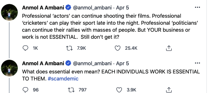 रिलायंस कैपिटल लिमिटेड के पूर्व एग्जीक्यूटिव डायरेक्टर 29 साल के अनमोल ने अपने ट्वीटर पर लॉकडाउन के सख्त नियमों की एक के बाद एक आलोचला की है। अनमोल ने अपने एक ट्वीट में कहा, "एक्टर्स अपनी फिल्मों की शूटिंग कर सकते हैं। क्रिकेटर देर रात तक खेल सकते हैं। नेता रैलियां भी कर सकते हैं, लेकिन आपका कारोबार या काम जरूरी नहीं है। उन्होंने #scamdemic का प्रयोग कर लिखा कि आखिर जरूरी होने का अर्थ क्या होता है? हर किसी का काम उसके लिए जरूरी होता है।"