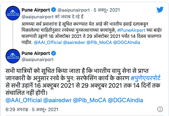 दरअसल, पुणे एयरपोर्ट ने सभी उड़ानों को रद्द करने के पीछे रन-वे के री-सरफेसिंग कराए जाने का हवाला दिया है। मंगलवार को अपने अधिकारिक बयान में अथॉरिटी ने ट्विटर के जरिए कहा, "सभी यात्रियों को सूचित किया जाता है कि भारतीय वायु सेना से प्राप्त जानकारी के अनुसार रनवे के पुन: सरफेसिंग कार्य के कारण पुणे एयरपोर्ट से सभी उड़ानें 16 अक्टूबर से 29 अक्टूबर 2021 तक 14 दिनों तक संचालित नहीं होंगी।" ये एयरपोर्ट एयरफोर्स स्टेशन के तहत आता है।