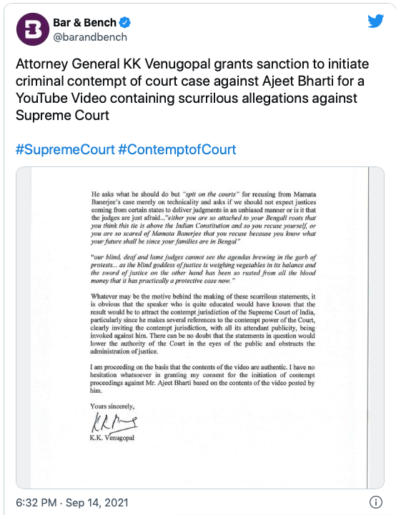 वकील कृतिका सिंह ने वेणुगोपाल को पत्र लिखकर अदालत की अवमानना कानून की धारा 15 के तहत सहमति देने का अनुरोध किया था। अदालत के अलावा किसी अन्य व्यक्ति द्वारा आपराधिक अवमानना कार्यवाही की शुरुआत करने के लिए एक जरूरी शर्त है।