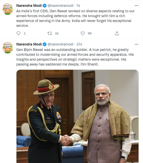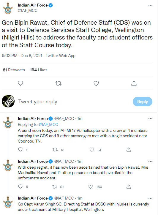 भारतीय वायुसेना ने ट्विटर पर इस बात की पुष्टि की है कि चीफ ऑफ डिफेंस स्टाफ इसमें थे। उन्होंने आज सुबह दिल्ली से सुलुर के लिए फ्लाइट ली थी। ट्वीट में कहा गया है, 'वायुसेना के एमआई-17वी5 हेलीकॉप्टर,जिसमें सीडीएस जनरल विपिन रावत सवार थे आज कूनूर (तमिलनाडु ) के निकट दुर्घटनाग्रस्त हो गया। दुर्घटना के कारणों का पता लगाने के लिए जांच आदेश दिया गया है।'
