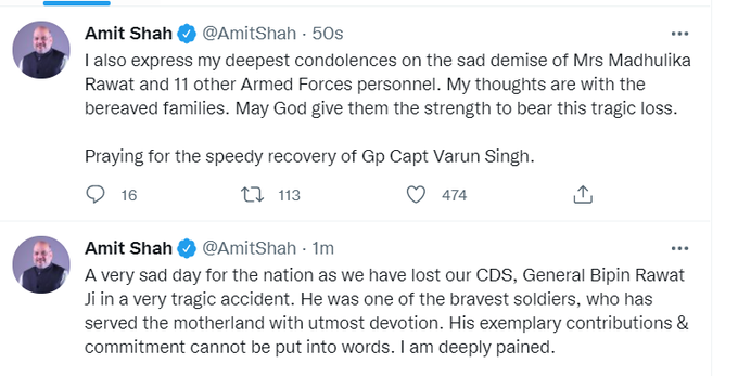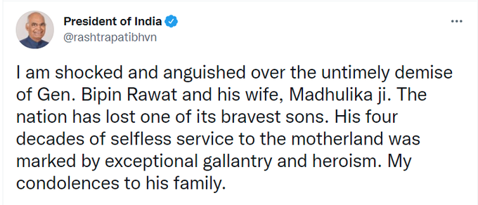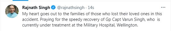 इस दुर्घटना में सीडीएस बिपिन रावत और 12 अन्य लोगों की मृत्यु पर रक्षा मंत्री राजनाथ सिंह, गृह मंत्री अमित शाह सहित प्रधानमंत्री नरेंद्र मोदी और राष्ट्रपति रामनाथ कोविंद ने शोक संवेदना व्यक्त की है।