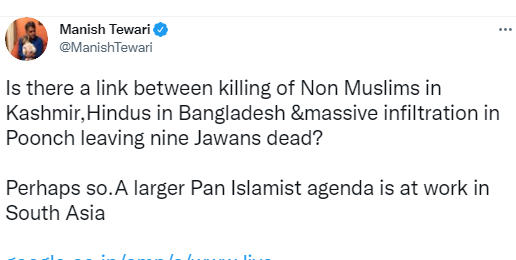 मनीष तिवारी ने ट्वीट किया "क्या कश्मीर में हो रही गैर-मुसलमानों की हत्या, बांग्लादेश में हो रही हिंदुओं की हत्या और पुंछ में 9 जवानों की शहादत के बीच कोई लिंक है? शायद ऐसा है। दक्षिण एशिया में एक बड़ा इस्लामिक एजेंडा काम कर रहा है।'