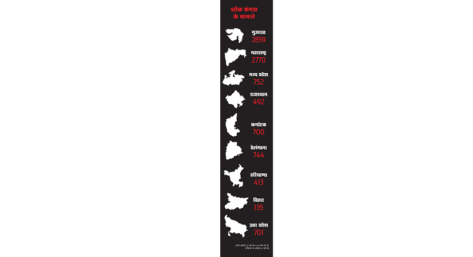 महामारी कोविड-19 की प्रचंड दूसरी लहर से तो बिहार में गोपालगंज के 40 वर्षीय अतुल श्रीवास्तव बच गए मगर एक ऐसी बीमारी के जानलेवा चंगुल में फंस गए, जिसे हाल तक खास चर्चा के लायक नहीं माना जाता था और जिसके बिरले मरीज ही अस्पतालों में पहुंचते थे। अतुल ब्लैक फंगस (या म्यूकोरमाइकोसिस) के शिकार होकर अपनी एक आंख गंवा चुके हैं और अब लखनऊ के किंग जॉर्ज मेडिकल कॉलेज (केजीएमसी) में मौत से जूझ रहे हैं। अब तक सात लाख रुपये से ज्यादा खर्च कर चुके उनके 70 वर्षीय पिता राजेंद्र श्रीवास्तव बताते हैं कि पटना के डॉक्टरों ने जवाब दे दिया तो इस उम्मीद में लखनऊ पहुंचे कि शायद अतुल के दो मासूम बच्चों की दुआ लग जाए और उनका जवान बेटा ठीक हो जाए। महामारी के प्रकोप से तो अब दूर देहात कराह उठे हैं, जो पिछले साल पहली लहर में सुरक्षित थे। गंगा में तैरती और रेत में दफन लाशें इसकी गवाह बन गई हैं। इस बीच ब्लैक फंगस नामक नई आफत का साया देश में तेजी से पसरता जा रहा है। फिलहाल ब्लैक फंगस के शिकार लोगों का आंकड़ा 11,717 दर्ज हो चुका है, जो जाहिर है कोरोना के अब सक्रिय जानलेवा म्युटेंट के शिकार लोगों के आंकड़ों की तरह बेहद नाकाफी हो सकता है। यानी इसके शिकार भी दर्ज आंकड़ों से काफी ज्यादा हो सकते हैं। इन आंकड़ों के मुताबिक ही इनमें से 219 (25 मई तक) लोगों की मौत हो चुकी है।