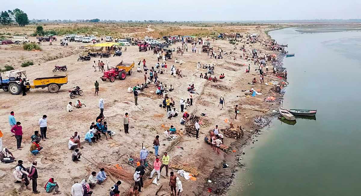 बैहिसाब मौतेंः उन्नाव में गंगा तट पर दाह संस्कार करते मृतकों के परिजन