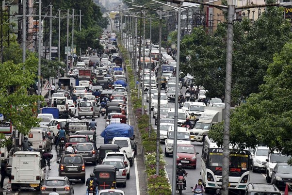 गुवाहाटी में कोविड-19 लॉकडाउन के ढील बाद सड़क पर दौड़ते वाहन (PTI)