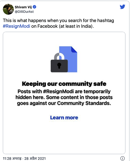 अलग-अलग तरह के हैशटैग का इस्तेमाल करते हुए सरकार को घेरने की कोशिश की जा रही है। फेसबुक पर पीएम मोदी के इस्तीफे की मांग को लेकर यूजर #ResignModi वाले टैग के साथ पोस्ट करना और इस्तीफे की मांग करना शुरू किया लेकिन, कुछ देर बाद ही फेसबुक ने इसे ब्लॉक कर दिया। इस हैशटैग के ब्लॉक होने का मामला जैसे ही तूल पकड़ा और यूजर ने शिकायत की तो फेसबुक ने अपनी गलती मानी और बाद में फिर इसे बहाल कर दिया।