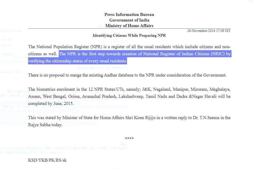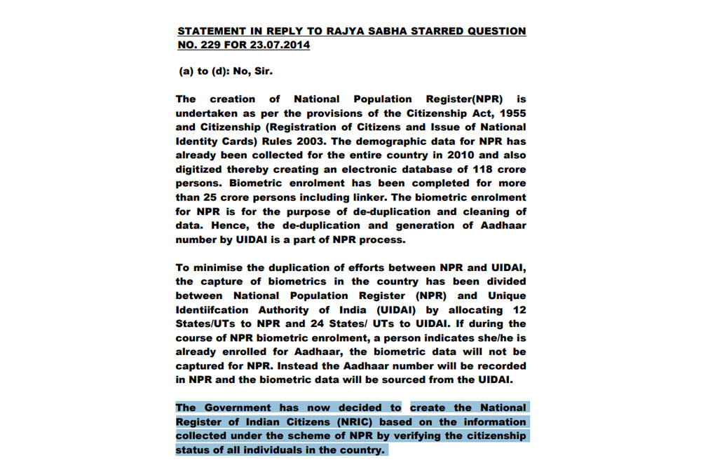 रिजिजू ने नवंबर 2014 में एनआरसी और एनपीआर के बीच संबंध को एक बार फिर से राज्य सभा में डॉ टी.एन.सेमा को एक लिखित जवाब में दोहराया। उन्होंने कहा, "एनपीआर नेशनल रजिस्टर ऑफ इंडियन सिटीजंस (एनआरआईसी) के निर्माण की दिशा में पहला कदम है, जो हर सामान्य निवासियों की नागरिकता की स्थिति की पुष्टि करता है।"