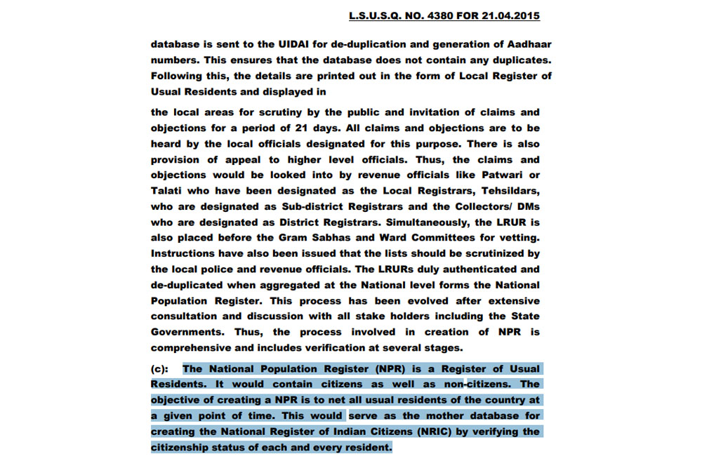 केन्द्रीय गृह राज्य मंत्री हरिभाई परथीभाई चौधरी ने 21 अप्रैल, 2015 को लोकसभा में एक प्रश्न का उत्तर देते हुए कहा, "एनपीआर बनाने का उद्देश्य किसी निश्चित समय पर देश के सभी सामान्य निवासियों की पुष्टि करना है। प्रत्येक नागरिक की नागरिकता की स्थिति की पुष्टि करके नेशनल रजिस्टर ऑफ इंडियन सिटीजंस (एनआरआईसी) बनाने के लिए ‘मदर डेटाबेस’ के रूप में काम करेगा।"