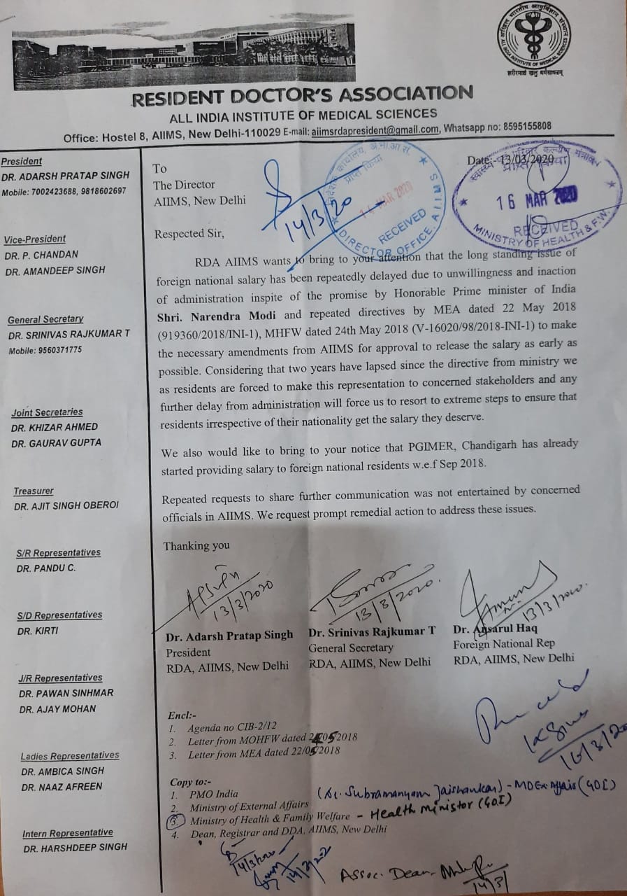 सिंह का कहना है कि केंद्रीय स्वास्थ्य मंत्रालय के कहे मुताबिक चंडीगढ़ के पोस्ट ग्रेजुएट इंस्टीट्यूट ऑफ मेडिकल एजुकेशन एंड रिसर्च (पीजीआईएमईआर) ने तो सितंबर 2018 से वेतन जारी करना शुरू कर दिया था और पांडिचेरी के जवाहरलाल इंस्टीट्यूट ऑफ पोस्टग्रेजुएट में चिकित्सा शिक्षा और अनुसंधान ने भी अब इसी तरह का निर्णय ले लिया है। हालांकि, एम्स प्रशासन ने बार-बार याद दिलाने के बावजूद इसे पूरी तरह से नजरअंदाज कर दिया है।