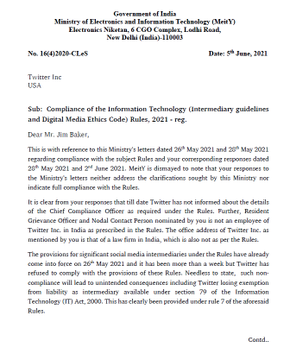 सूचना मंत्रालय ने कहा है कि कंपनी के जवाबों से ये स्पष्ट है कि उसने आज तक नियमों के तहत आवश्यक मुख्य अनुपालन कार्यालय के विवरण के बारे में सूचित नहीं किया है। इसके अलावा, यह भी कहा गया है कि नए नियमों के तहत आवश्यक निवासी शिकायत अधिकारी और मंच द्वारा नामित नोडल संपर्क व्यक्ति भारत में इसके कर्मचारी नहीं हैं।