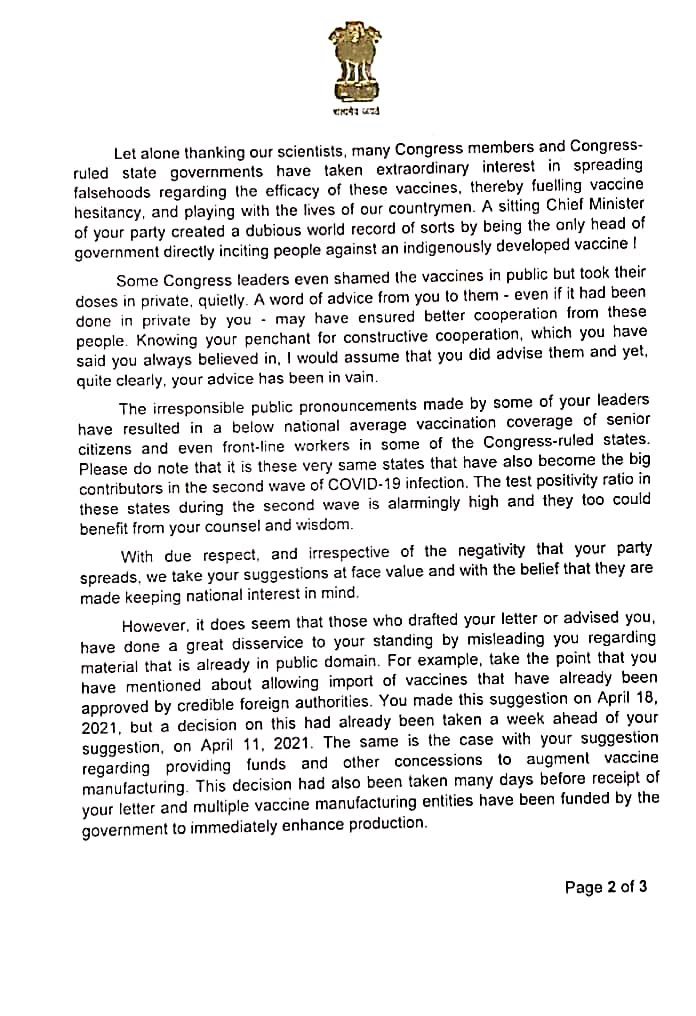 पत्र में हर्षवर्धन ने कहा कि दुनियाभर में भारत की वैक्सीन की चर्चा हो रही है। यहां महामारी के खिलाफ 2 वैक्सीन है और यह भारत के लिए गर्व की बात है। इसके बाद भी कांग्रेस के वरिष्ठ नेताओं ने वैज्ञानिकों की तारीफ में एक शब्द भी नहीं कहा। इससे पता चलता है कि पार्टी में शीर्ष पर बैठे लोगों का नजरिया कैसा है।