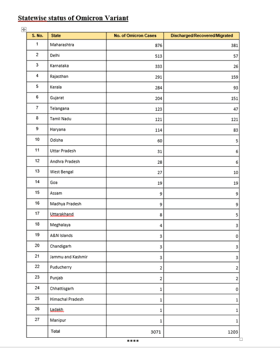 केंद्रीय स्वास्थ्य मंत्रालय के ताजा आंकड़ों के अनुसार, भारत के 27 राज्यों और केंद्र शासित प्रदेशों में ओमिक्रोन के अब तक कुल 3,071 मामले सामने आए हैं, जिसमें से 1,203 लोग रिकवर भी हो चुके हैं।