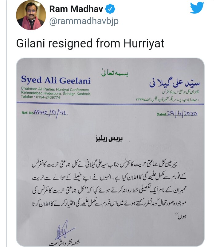 उन्होंने हुर्रियत कांफ्रेंस के सभी घटक दलों के नाम एक पत्र भी जारी किया है। अपने आडियो संदेश में उन्होंने कहा है कि माैजूदा हालात में मैं आल पार्टी हुर्रियत कांफ्रेंस से इस्तीफा देता हूं। मैने हुर्रयित के सभी घटक दलों और मजलिस ए शूरा को भी अपने फैसले से अवगत करा दिया है।