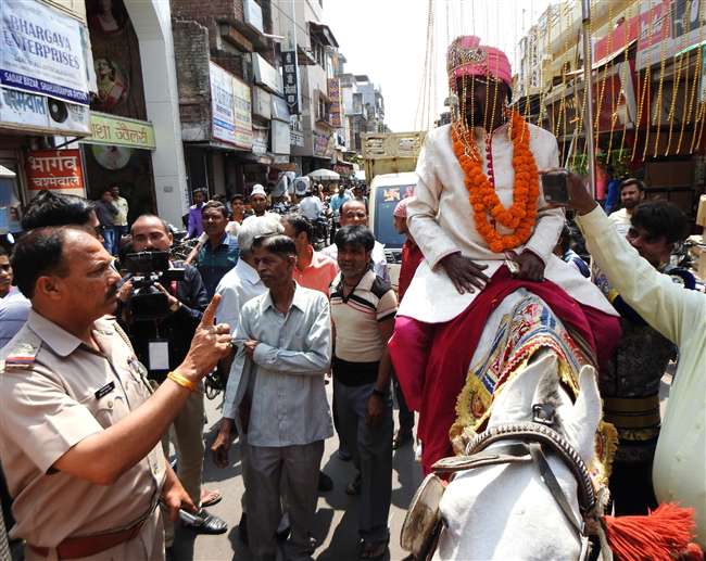 शाहजहांपुर जिले के लोकसभा चुनाव में एक उम्मीदवार काफी सुर्खियां बंटोर रहा है। सर पर सेहरा बांध कर और घोड़ी पर सवार होकर बैंड बाजे की धुन पर नाचते हुए बारातियों के साथ अनोखे अंदाज में इसने नामांकन दर्ज कराया है। संयुक्त विकास पार्टी के प्रत्याशी वैद्यराज किशन पहले भी इस तरह के अपने अनोखे अंदाज के लिए जाने जाते रहे हैं।