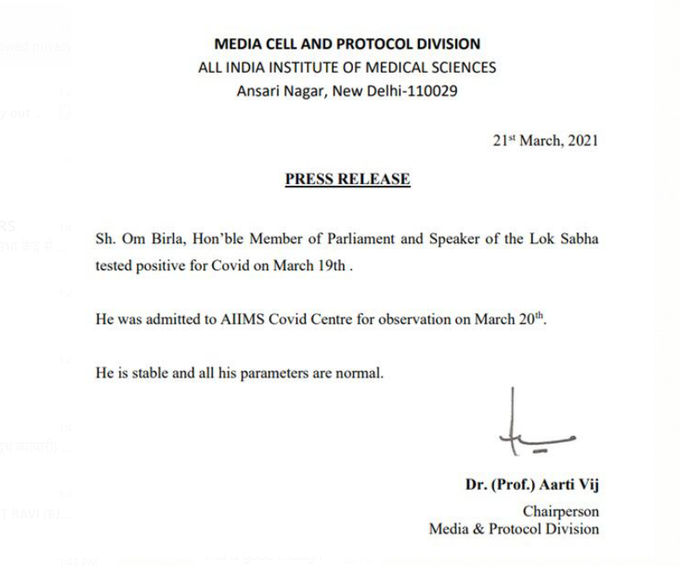 लोकसभा स्पीकर ओम बिरला कोरोना संक्रमित हो गए हैं। उन्हें एम्स दिल्ली में भर्ती कराया गया हैं। अस्पताल की ओर से इसकी जानकारी रविवार को दी गई है। एम्स के मुताबिक लोकसभा स्पीकर 19 मार्च को कोरोना पॉजिटिव पाए गए थे और 20 मार्च को निगरानी के एम्स कोविड सेंटर में भर्ती हुए हैं। फिलहाल उनकी हालत स्थिर है।