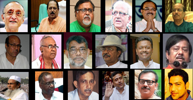 (फोटो में क्रम से) वित्त मंत्री अमित मित्र पर दाग नहीं लगा था। लेकिन सुब्रत मुखर्जी, पार्थ चटर्जी, शोभनदेव चटर्जी, कोलकाता के मेयर शोभन चट्टोपाध्याय, साधन पांडे, जावेद खान, वाममोर्चा की सरकार में मंत्री रहे अब्दुल रज्जाक मोल्ला, पूर्णेंदु बोस, अरूप राय, फिरहाद हाकिम, ज्योतिप्रिय मल्लिक पर या तो नारद कांड के दाग हैं या फिर थानों में मामले दर्ज हैं। इन सभी को साथ लेकर ममता बनर्जी ने चुनाव प्रचार भी किया था और नारद सीडी कांड को तृणमूल कांग्रेस के खिलाफ षडयंत्र बताया था।