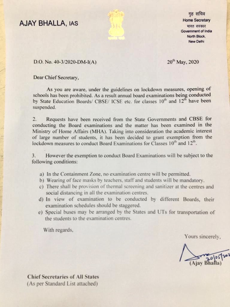 बोर्ड परीक्षाओं के संचालन के लिए राज्य सरकारों और सीबीएसई से अनुरोध प्राप्त हुए हैं और गृह मंत्रालय में मामले की जांच की गई है। उन्होंने आगे कहा, "बड़ी संख्या में छात्रों के शैक्षणिक हित को ध्यान में रखते हुए, कक्षा 10 और 12 के लिए बोर्ड परीक्षा आयोजित करने के लिए लॉकडाउन के उपायों से छूट देने का निर्णय लिया गया है।"