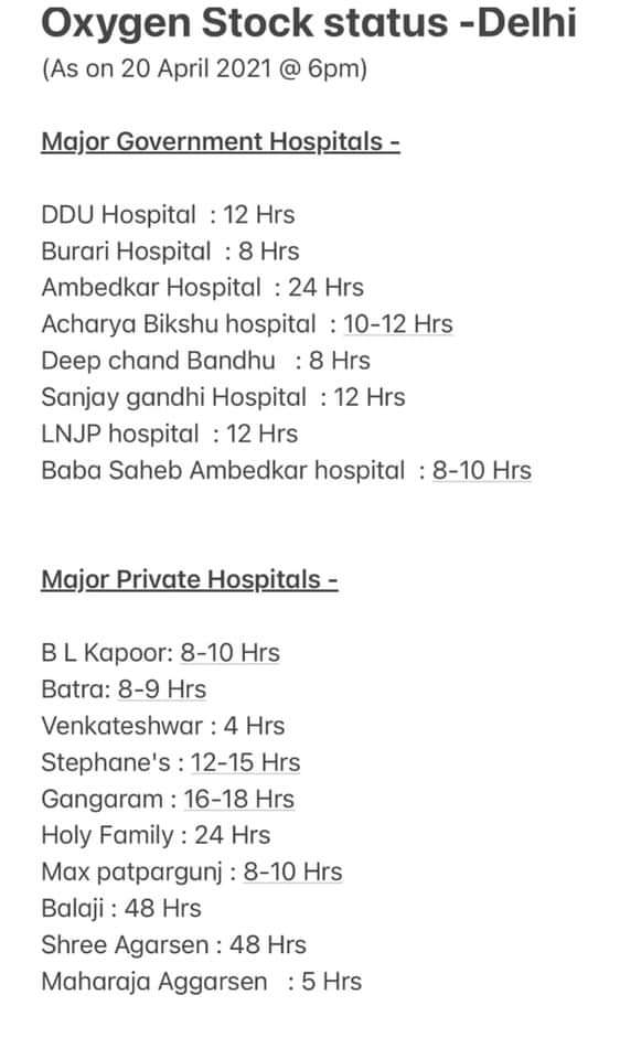वहीं, दिल्ली के मुख्यमंत्री अरविंद केजरीवाल ने ट्वीट कर कहा है, "दिल्ली में गंभीर ऑक्सीजन संकट बना हुआ है। मैं फिर से केंद्र से आग्रह करता हूं कि वो दिल्ली को तत्काल ऑक्सीजन उपलब्ध कराए। कुछ अस्पतालों में ऑक्सीजन के कुछ ही घंटे बचे हैं।"