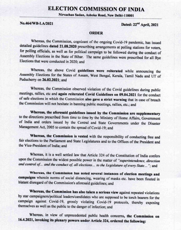 चुनाव आयोग चार राज्यों के चुनाव संपन्न होने के बाद और पश्चिम बंगाल चुनाव के छह चरणों के मतदान खत्म होने के बाद ये फैसला लिया है। बंगाल चुनाव के अब दो चरण शेष रह गए हैं।