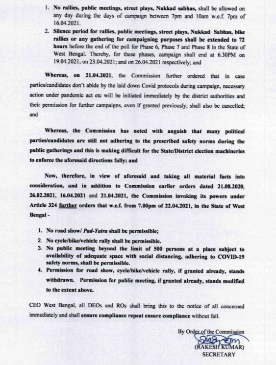 आयोग के मुताबिक साइकिल/बाइक/वाहन रैलियों की जो अनुमति राजनीतिक दलों को दी गई थी उसे वापस ले लिया गया है। आयोग ने इस बात को लेकर भी नाराजगी जताई है कि कई राजनीतिक दल और प्रत्याशी जनसभाओं के दौरान सुरक्षा मानकों का पालन नहीं कर रहे हैं। आयोग ने कहा है कि किसी भी तरह के रोड-शो, पदयात्रा या सइकिल, बाइक-वाहन रैली की अनुमति नहीं दी जाएगी।