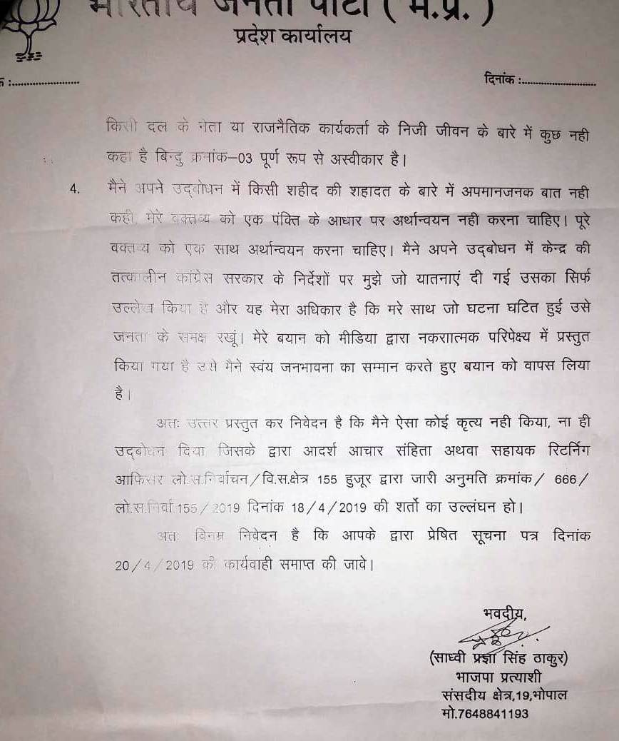 प्रज्ञा ठाकुर ने चुनाव आयोग को भेजे गए जवाब में कहा कि उनकी ओर से शहीद की शहादत का अपमान नहीं किया गया। प्रज्ञा ने चुनाव आयोग को भेजे गए अपने जवाब में कहा कि वक्तव्य की एक पंक्ति के आधार पर आशय नहीं निकालना चाहिए, बल्कि पूरे वाक्य का अर्थ निकाला जाना चाहिए।