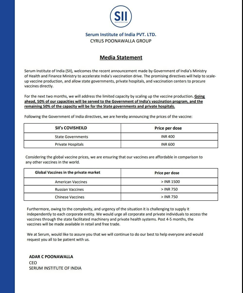 वैक्सीन को लेकर केंद्र सरकार के निर्देशों के बाद कोविशील्ड वैक्सीन बनाने वाली कंपनी सीरम इंस्टीट्यूट ऑफ इंडिया ने बुधवार को राज्य सरकारों और प्राइवेट अस्पतालों के लिए अपने नए दामों की लिस्ट जारी कर दी है।