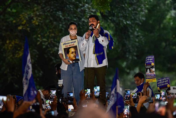 भीम आर्मी चीफ चंद्रशेखर आजाद ने हाथरस में 19 वर्षीय दलित महिला की मौत के विरोध में जंतर-मंतर पर लोगों को संबोधित किया।