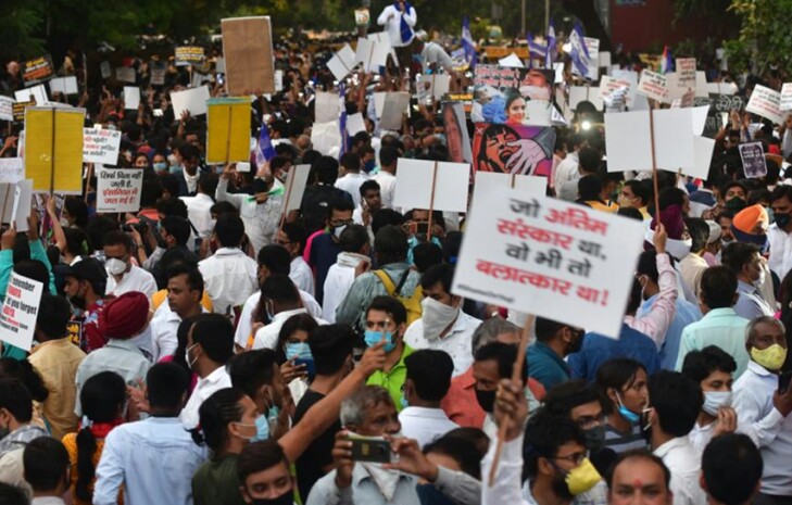 हाथरस में 19 वर्षीय दलित महिला की मौत के विरोध में लोग जंतर-मंतर पर इकट्ठा हुए।