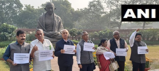 - दिल्ली के संसद परिसर में नागरिकता संशोधन बिल 2019 का विरोध करते वाम दलों के नेता