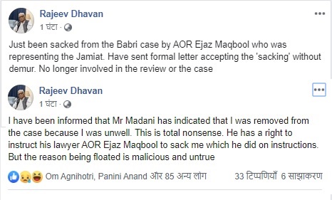 राजीव धवन ने फेसबुक पोस्ट में लिखा कि बाबरी केस के वकील (एडवोकेट ऑन रिकॉर्ड) एजाज मकबूल ने उन्हें बर्खास्त कर दिया है, जो जमीयत का मुकदमा देख रहे हैं। उनका आरोप है कि बिना किसी डिमोर के उन्हें बर्खास्तगी का पत्र भेजा गया है। उन्होंने आगे कहा कि अब वह दाखिल की गई पुनर्विचार याचिका मामले का हिस्सा नहीं हैं। उन्होंने कहा, “मुझे बताया गया है कि मदनी ने मेरी बर्खास्तगी के बारे में कहा है। मेरी तबीयत का हवाला देते हुए मुझे हटाया गया है जो कि बिल्कुल निराधार बात है। जमीयत को ये हक है कि वो मुझे केस से हटा सकते हैं लेकिन जो वजह दी गई है वह गलत है।”