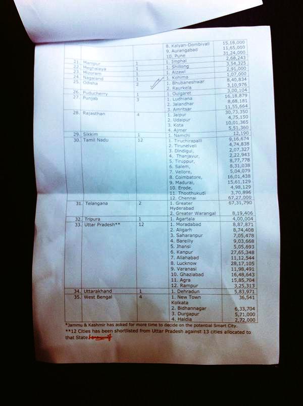शहरी विकास मंत्रालय की अोर से जारी स्मार्ट सिटी की सूची में यूपी के बाद तमिलनाडु के सबसे ज्यादा 12, महाराष्ट्र के 10, मध्य प्रदेश के 7, गुजरात और कर्नाटक के 6-6, आंध्र प्रदेश और बिहार के तीन-तीन शहरों को जगह दी गई है। यूपी से अभी एक और शहर चुना जाएगा। इस तरह कुल 24 राज्यों की राजधानियों को स्मार्ट सिटी बनाने की तैयारी है। जम्मू-कश्मीर सरकार ने अपने शहरों के नाम तय करने के लिए कुछ और समय मांगा है। दरअसल, राज्यों में शहरों के चयन को लेकर काफी विवाद हो रहा है। उत्तर प्रदेश में मेरठ के बजाय रायबरेली को स्मार्ट सिटी बनाने का मुद्दा तूल पकड़ता जा रहा है। इन दोनों शहरों में से किसे चुना जाएगा, इस बारे में फिलहाल केंद्र ने भी फैसला नहीं लिया है। इस तरह 100 में से सिर्फ 98 शहरों की सूची जारी की गई है।
