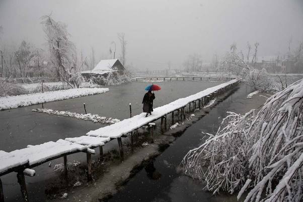 श्रीनगर में डल झील के बीच कश्मीरी व्यक्ति बर्फ से ढके फुटब्रिज पर चलता हुआ/ एपी फोटो/ डार यासीन