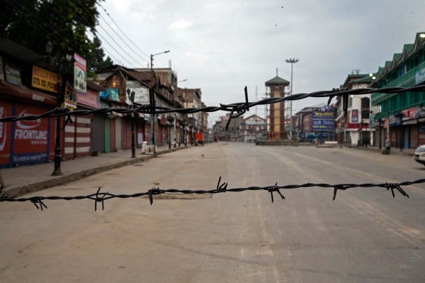श्रीनगर में कर्फ्यू के दौरान सुनसान सड़क पर कटीले तार से की गई नाकाबंदी/ एपी फोटो/ डार यासीन