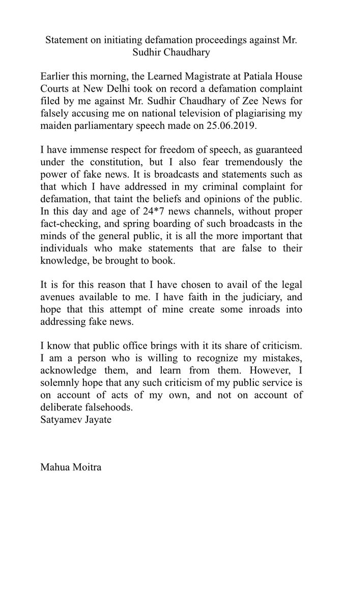 ट्विटर पर साझा किए गए बयान में महुआ ने कहा कि वे संविधान में दी गई अभिव्यक्ति की आजादी का सम्मान करती हैं, लेकिन उन्हें फेक न्यूज़ की ताकत का भी अंदाजा है।