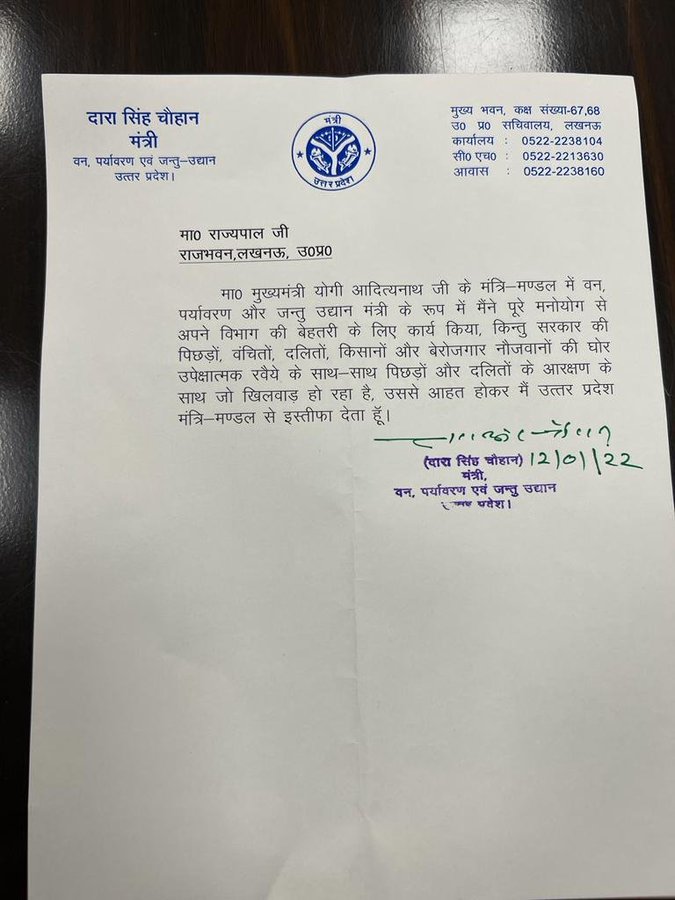 वन और जन्तु उद्यान मंत्री दारा सिंह चौहान ने राज्यपाल को भेजे लेटर में लिखा है, ''मैंने पूरे मनोयोग से अपने विभाग की बेहतरी के लिए काम किया, लेकिन योगी सरकार की पिछड़ों, वंचितों, दलितों, किसानों और बेरोजगार नौजवानों की घोर उपेक्षात्मक रवैये के साथ-साथ पिछड़ों और दलितों के आरक्षण के साथ जो खिलवाड़ हो रहा है, उससे आहत होकर मैं उत्तर प्रदेश मंत्रिमंडल से इस्तीफा दे रहा हूं।