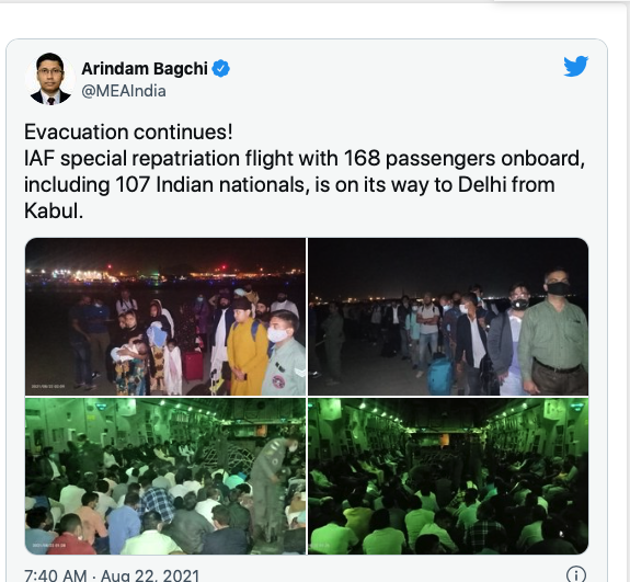 अफगानिस्तान से 168 यात्रियों को लेकर आज सुबह उड़ा भारतीय वायु सेना का विमान सी-17 ग्लोबमास्टर हिंडन एयरफोर्स पहुंचा। विदेश मंत्रालय के मुताबिक, इस विमान में 107 भारतीय नागरिकों के साथ अफगानी भी सवार थे। सभी की सुरक्षित भारत में लैंडिंग करा ली गई है। इस दौरान एक भावुक कर देने वाली तस्वीरें सामने आई। अफगानिस्तान के सांसद नरेंद्र सिंह खालसा काबुल से भारत पहुंचते ही रो पड़े। उन्होंने कहा, "मुझे रोने का मन कर रहा है ... पिछले 20 वर्षों में जो कुछ भी बनाया गया था वह अब समाप्त हो गया है। अब यह शून्य है।"