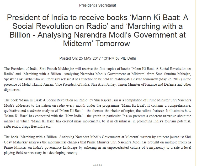 पिछले साल 25 मई को पत्र सूचना कार्यालय (पीआईबी) की ओर से जारी विज्ञप्ति में राष्ट्रपति भवन में दो किताबों के विमोचन की जानकारी दी गई थी। इसमें एक किताब मन की बात: अ सोशल रिवोल्यूशन ऑन रेडियो थी। सरकारी विज्ञप्ति में इस किताब को राजेश जैन द्वारा पीएम के 'मन की बात' कार्यक्रम में दिए भाषणों का संकलन बताया गया था। गौरतलब है कि राजेश जैन एक आईटी उद्यमी हैं, जिनके बारे में माना जाता है कि उन्होंने 2014 से पहले नरेंद्र मोदी के प्रचार अभियान में अहम भूमिका निभाई थी।