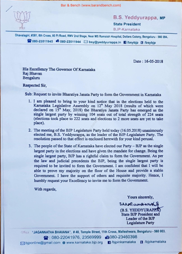16 मई को कर्नाटक के राज्यपाल को दिए बीएस येदियुरप्पा के पत्र से भी जाहिर है कि उन्होंंने अपने 104 विधायकों के अलावा आवश्यक बहुमत जुटाने का दावा तो किया मगर उन्हें भाजपा के अलावा किन विधायकाें का समर्थन प्राप्त है उनके नाम या संख्या नहीं बताई थी।